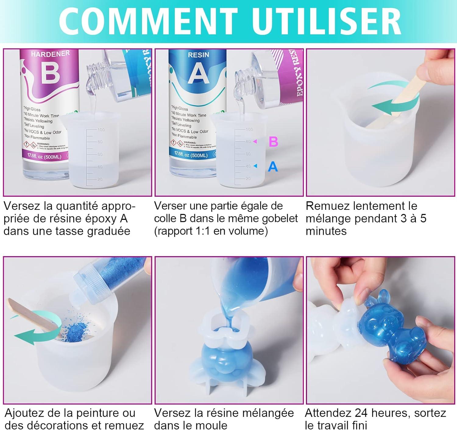 Nos resine epoxy kit comprennent une bouteille de résine de 500 ml et une bouteille de durcisseur de 100 ml (3.38oz), 2 tasses à mesurer, 2 x gants, 4 x bâtonnets bois, un cadeau parfait pour les débutants et les amateurs de résine.