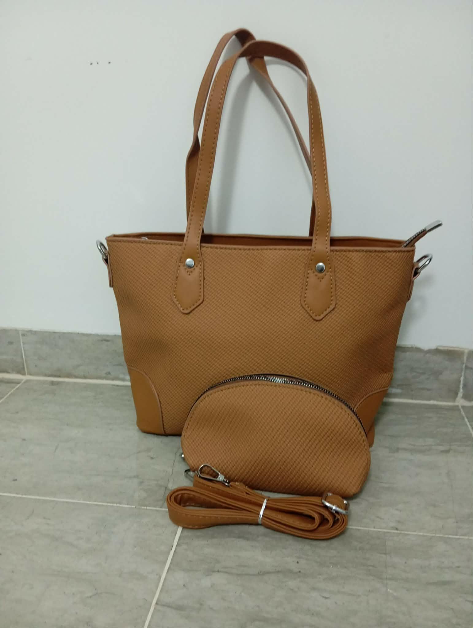 Ensemble Sac Cabas et Pochette Assortie en Similicuir Marron Texturé - Élégance et Fonctionnalité au Quotidien